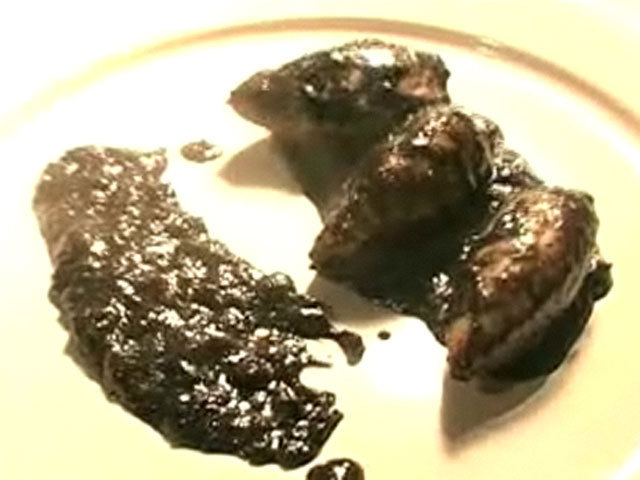 Рецепт приготовления кальмара.Состав:кальмар — 8 кусочков;лук — 2 штуки;томатный соус, белое вино, чернила кальмара, панировочные сухари.