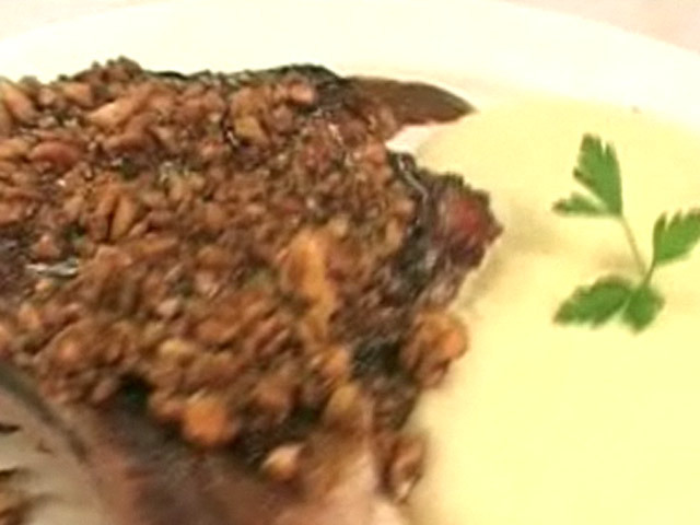 Рецепт рубленной телятины с миндалем и вином «Малага».Состав:телятина — 2 куска;вино, масло, соль, миндаль.