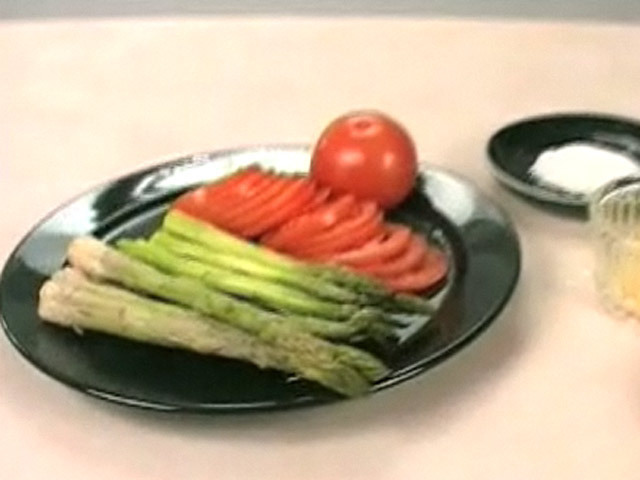 Рецепт приготовления спаржи с овощами и сыром.Состав:спаржа — 12 штук;помидоры — 2 штуки;соль, масло, сахар, тертый сыр, ароматические травы.
