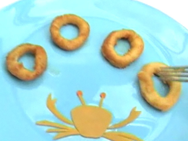 Веселое блюдо из кальмара.Состав:кольца кальмара — 70 гр яйцо — 1 штука;сыр — 1 кусочек;панировочные сухари, майонез, кетчуп, масло, соль.