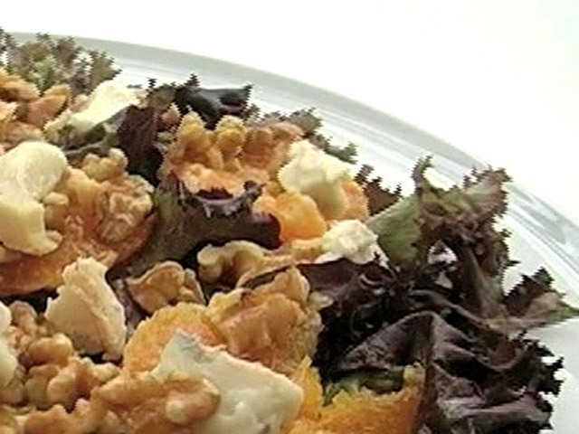 Салат с апельсином и сыром.Состав:грецкие орехи — 50 гр;апельсин — 1 штука;лолло россо — 1 качан;сыр горгонзо — 1 кусочек;оливковое масло, травяная соль, лимонный сок, мед.